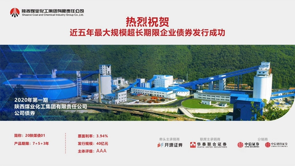 2020年3月13日,陜西煤業(yè)化工集團有限責(zé)任公司2020年第一期公司債券在中央國債登記結(jié)算有限公司簿記成功。債券發(fā)行規(guī)模40億元,期限7+5+3年期,票面利率3.94 %,比同期人民幣長期貸款基準(zhǔn)利率低近1個百分點,創(chuàng)國內(nèi)市場近五年超長期限企業(yè)債券單期發(fā)行最大規(guī)模。本期債券的成功發(fā)行,有效降低了陜煤集團長期融資成本,優(yōu)化了資產(chǎn)負(fù)債結(jié)構(gòu),進一步改善了營運資金流動性。